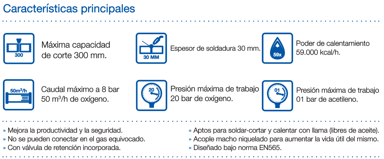 - Compatibilidad perfecta con reguladores y mangueras de oxígeno o gas