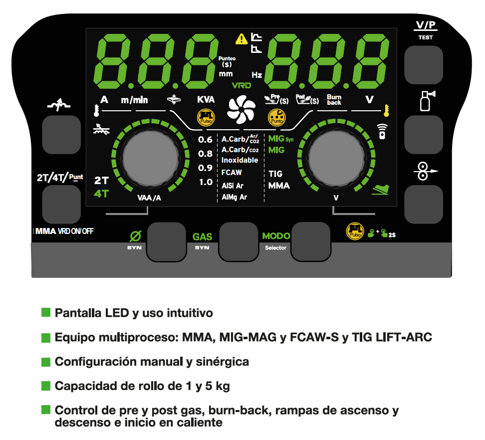 Incluye modo sinérgico y pantalla LED para configurar de forma intuitiva los parámetros de soldadura según el diámetro del hilo, el espesor del material y el gas de protección.